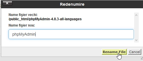 - v novem imeniku z imenom ustreznega arhiva, vendar brez .zip končnice, se bo pojavil znotraj imenika public_html. Ta imenik je potrebno preimenovati, tako da ostane le "phpMyAdmin". Preimenovanje se izvede tako, da izberete ustrezen imenik in pritisnete gumb "Preimenuj" na vrhu strani.