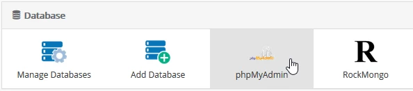 - Ko ste prijavljeni v administrativni plošči Webuzo, poiščite razdelek "Podatkovna baza" v prikazanem oknu in izberite "phpMyAdmin" od tam