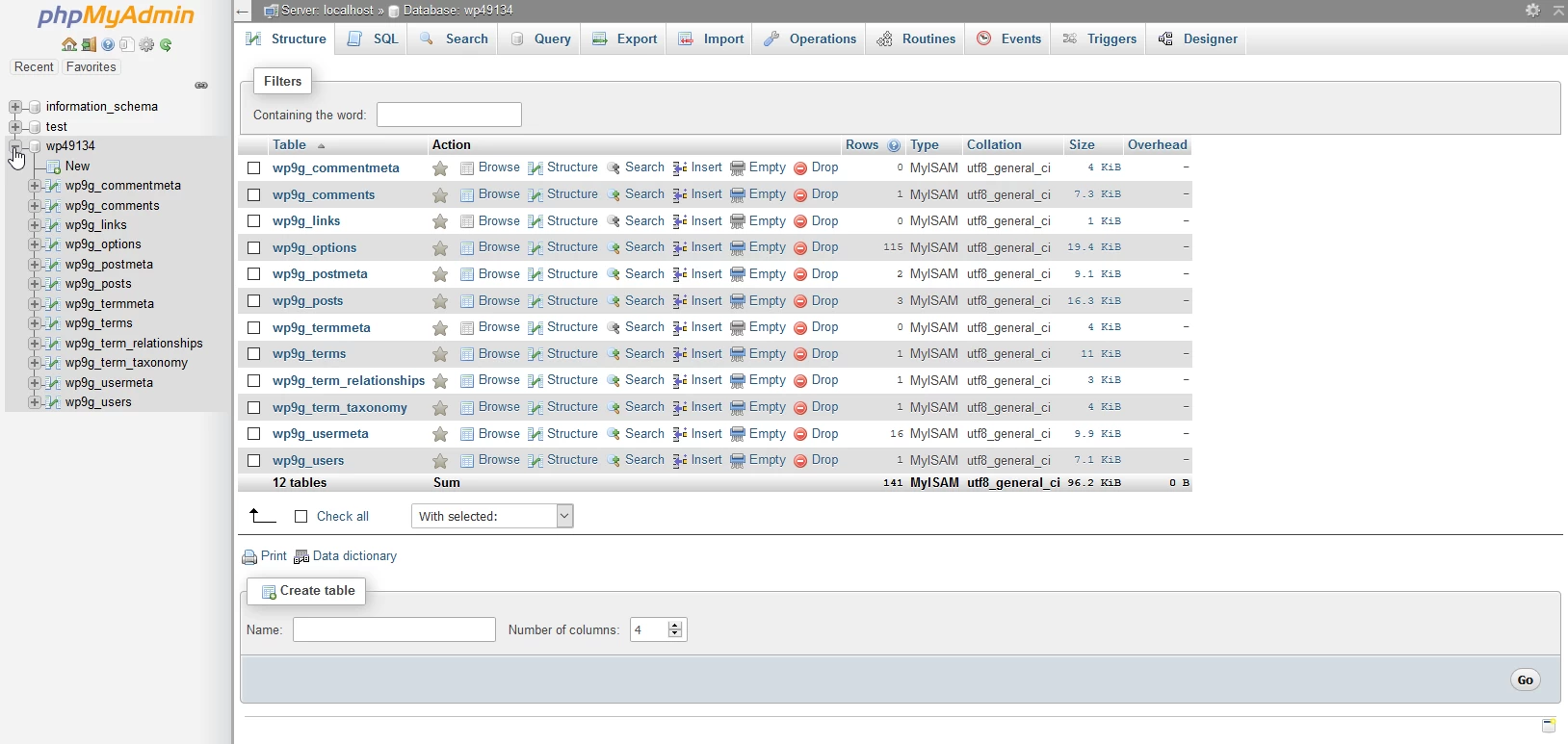 - Webuzo ima v panelu prednamestjeno aplikacijo PhpMyAdmin. Ta aplikacija nam omogoča grafični ogled baze podatkov.
