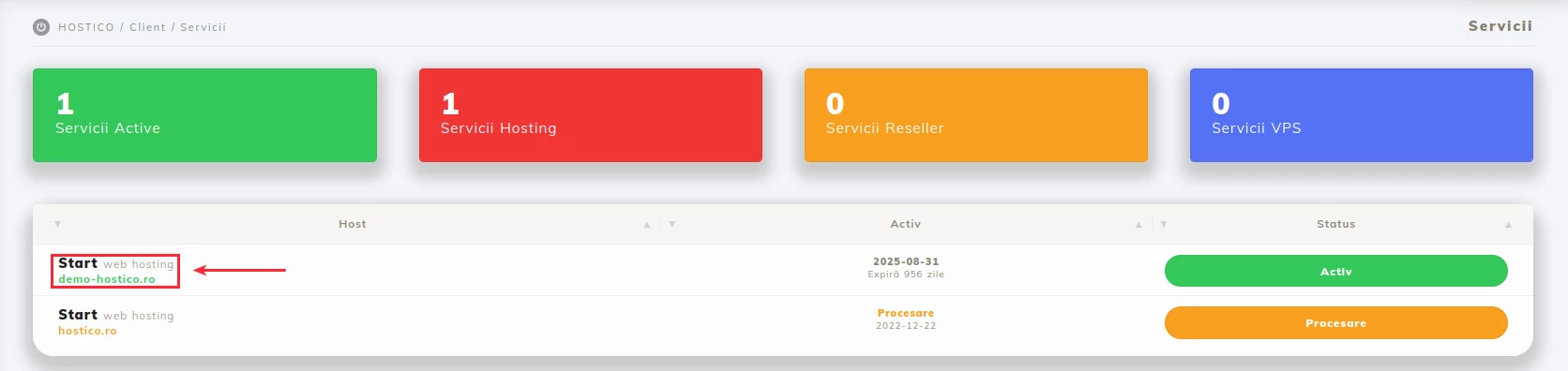 - Po prijavi v račun stranke Hostico pojdite na razdelek Storitve;