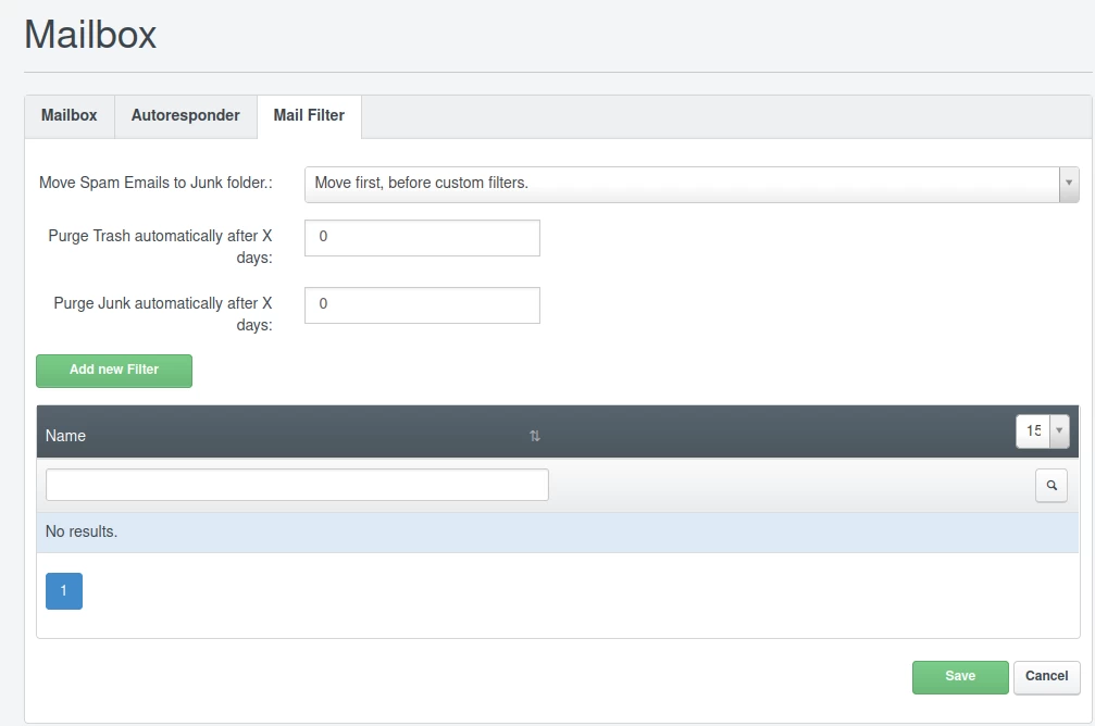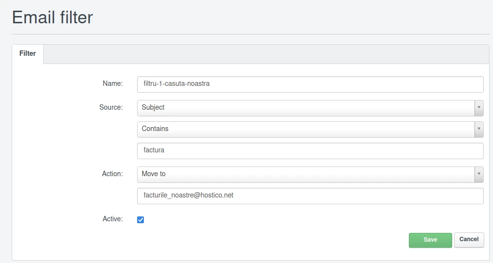 V zavihku Filtri e-pošte lahko nastavimo prilagodljive dodatne filtre za e-poštna sporočila, poslana v predal, ki se bodo avtomatsko izvajali, preden vstopijo v mapo Prejeto, in izvajali različne nastavljive akcije s pomočjo gumba Dodaj nov filter.