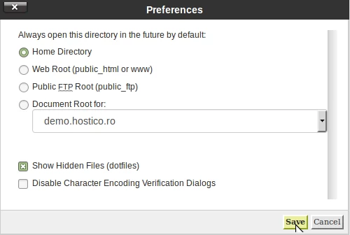 - V oknu, ki se bo pojavilo, bomo poskrbeli, da bo možnost Prikaži skrite datoteke (dotfiles) potrjena, nato pa bomo kliknili gumb Shrani.