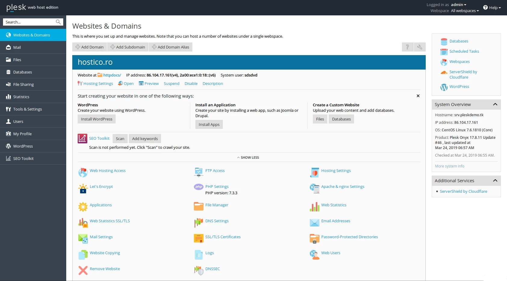 Vmesnik Plesk bo enak ne glede na izbran tip licence, razlika pa bo le v številu domen, ki jih lahko dodate v nadzorno ploščo.